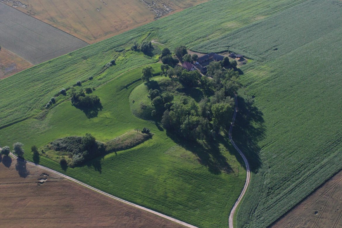 Ryc. 4. 2021 r. – Projekt „Antropopresja a dziedzictwo archeologiczne. Przykład Lednickiego Parku Krajobrazowego” dofinansowany ze środków Ministra Kultury i Dziedzictwa Narodowego”. Dokumentacyjne zdjęcie lotnicze grodziska w Moraczewie, gm. Łubowo (fot. Andrzej Kowalczyk)