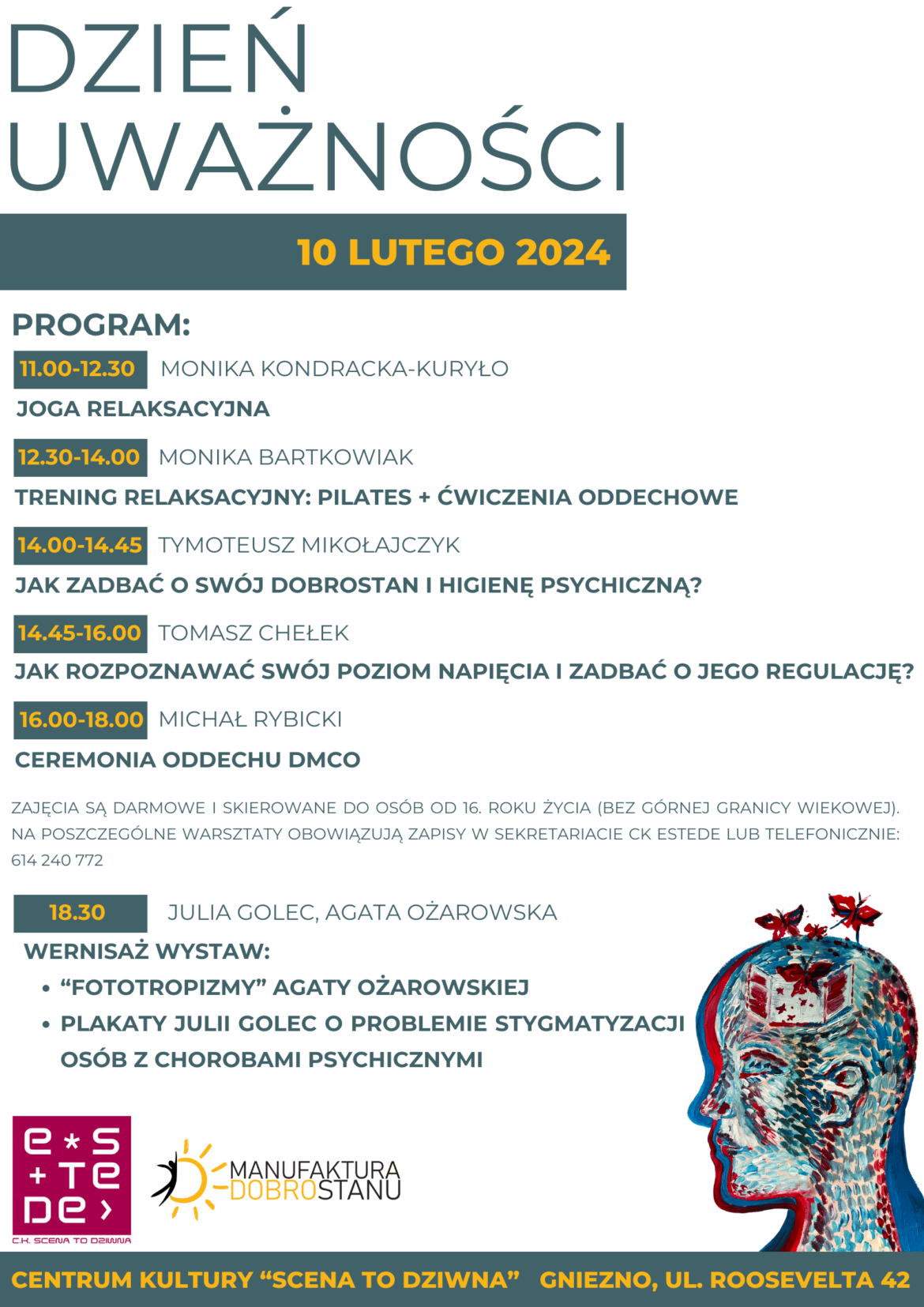 W obliczu wyzwań XXI wieku, które często zmuszają nas do nieustannej pracy, coraz trudniej znaleźć chwilę na wyciszenie. Aby zwrócić uwagę na to, jak istotny jest odpoczynek dla ciała i umysłu, Centrum Kultury „Scena to dziwna” oraz Manufaktura Dobrostanu serdecznie zapraszają w sobotę, 10 lutego 2024 roku, na Dzień Uważności.