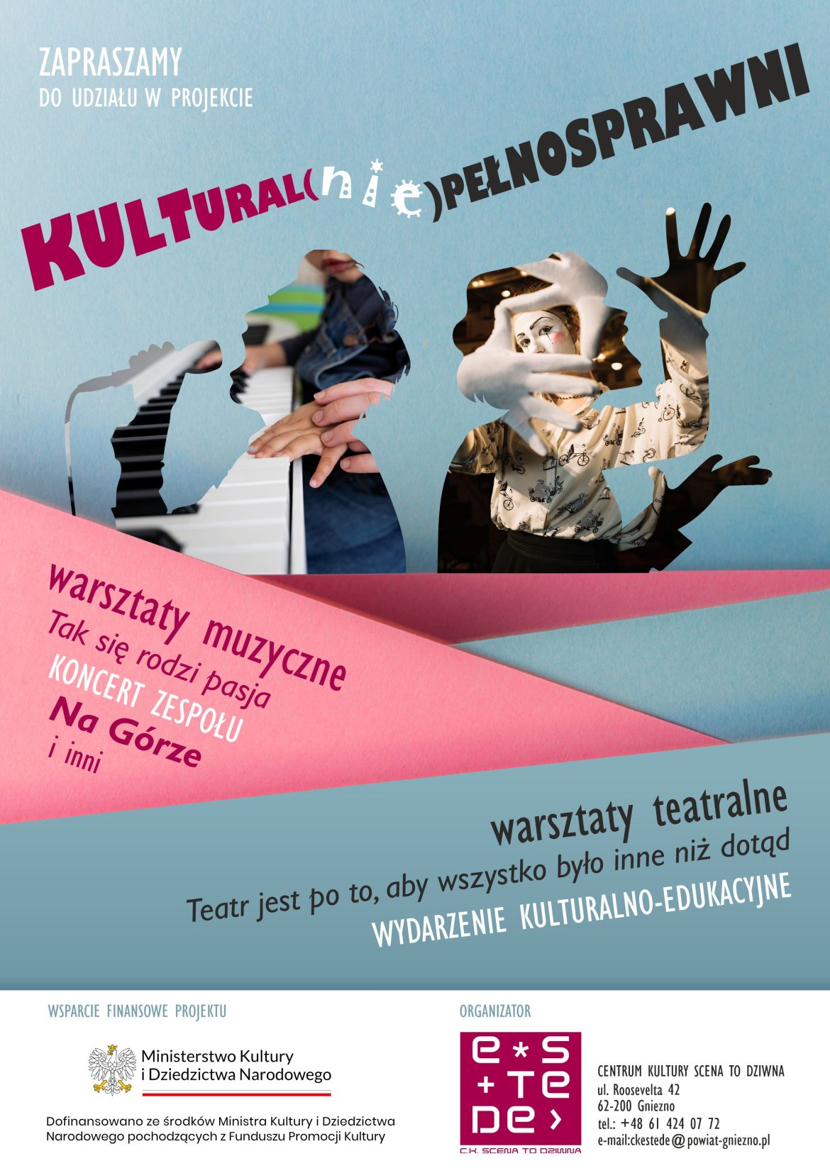 W ramach programu Edukacja Kulturalna” przygotowujemy projekt „Kultural(nie)pełnosprawni”. Zadanie składa się z cyklu warsztatów muzycznych oraz teatralnych.Zajęcia muzyczne dedykowane są podopiecznym gnieźnieńskich środowiskowych domów samopomocy. Poprowadzi je Bartosz Miecznikowski z fundacji „Muzyczni Czarodzieje”. Do udziału w warsztatach zaprosiliśmy ŚDS-y „DOM ANKI” oraz „DOM TĘCZA”. Uczestnicy bawić się będą muzyką, grając na instrumentach perkusyjnych oraz tworzyć autorskie piosenki. Zaprezentują je szerszej publiczności w czasie koncertu, na którym wystąpią obok uczestników sekcji działających w naszym Centrum Kultury.„Tak się rodzi pasja” to hasło towarzyszące warsztatom oraz koncertowi.