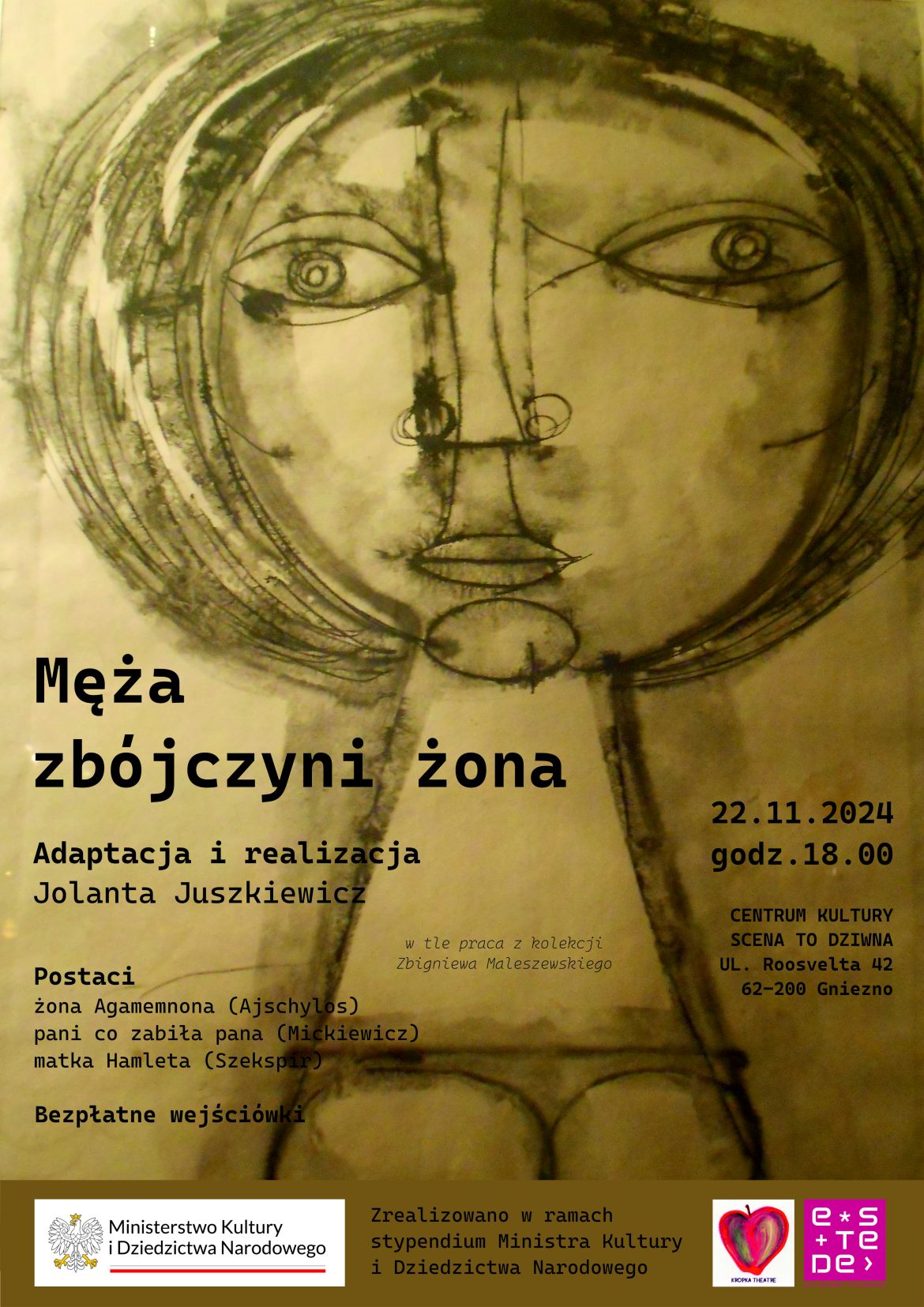 Centrum Kultury „Scena to dziwna” w Gnieźnie zaprasza mieszkańców na emocjonalny monodram pt. „Męża zbójczyni żona”, który odbędzie się 22 listopada o godzinie 18.00. Spektakl zostanie przedstawiony przez Jolantę Juszkiewicz, znaną reżyserkę, która ma na swoim koncie takie produkcje, jak „Pneumy” i „Kobiet Karamazow”, również wystawiane w Centrum.