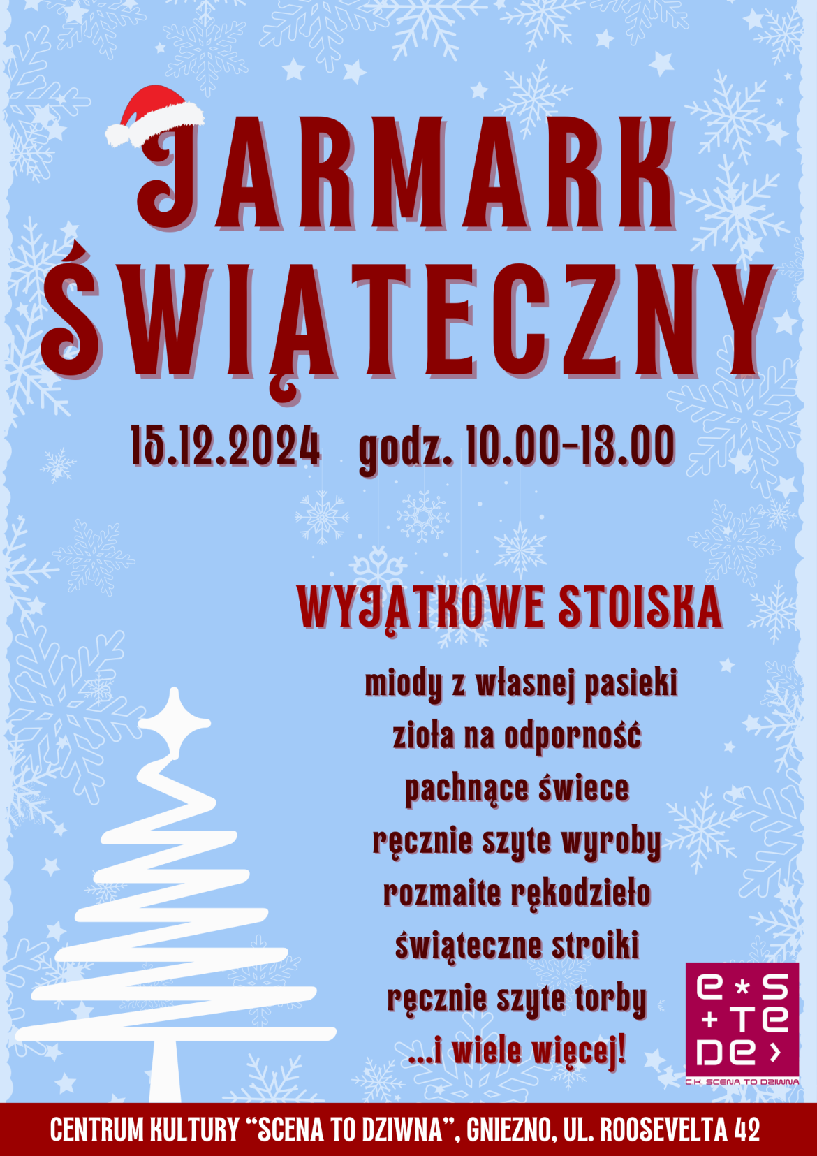 Centrum Kultury „Scena to dziwna” zaprasza na coroczny Jarmark Świąteczny, który odbędzie się 15 grudnia w godz. 10:00-13:00 w Sali widowiskowej. To doskonała okazja, by znaleźć oryginalne prezenty pod choinkę i poczuć magię świąt.